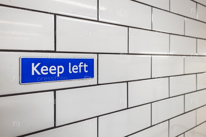 Знак «Держитесь левой стороны» на белой плитке на станции лондонского метрополитена