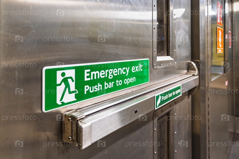 Зеленый знак аварийного выхода и толкатель на металлической двери, общественный безопасный доступ в метро