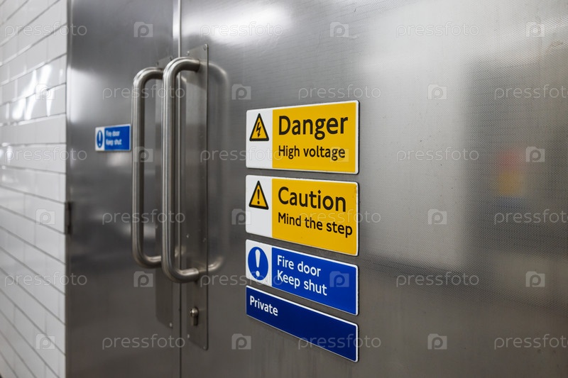 Металлические двери с многочисленными предупреждающими знаками в зоне общественной инфраструктуры