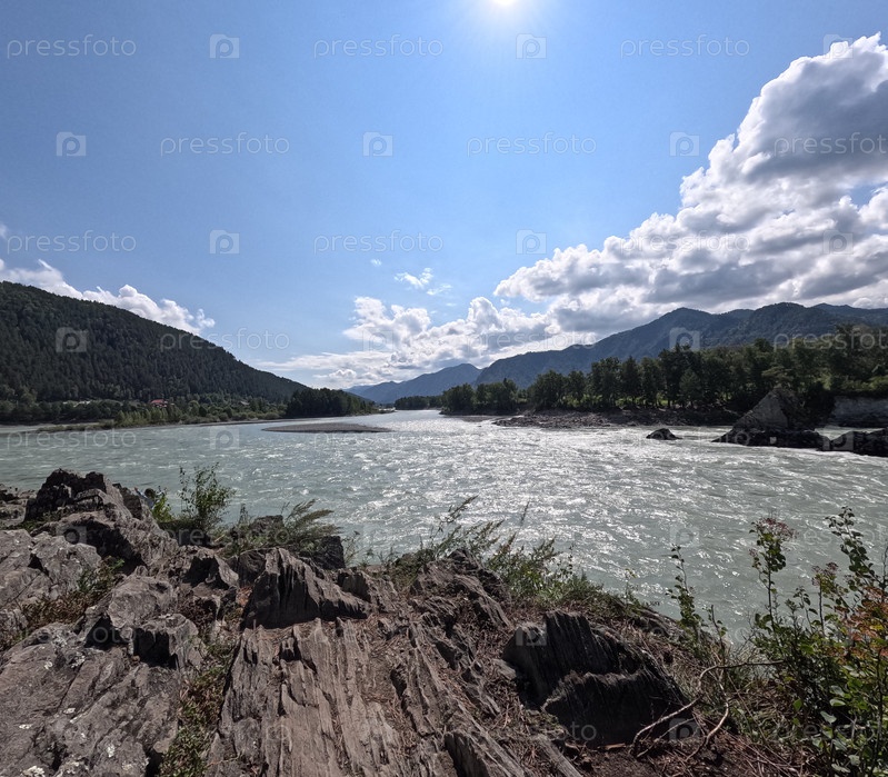 Зубы дракона или быки. Скалы на реке Катунь в поселке Элекмонар недалеко от населенного пункта Чемал. Республика Алтай. Лето. Dragon's teeth or bulls. Rocks on the Katun River in the village of Elekmonar near the village of Chemal. The Altai Republic. Sum