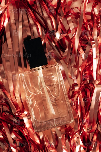 Крупный план прозрачного стеклянного флакона для духов с черной крышкой на блестящем красном фоне из металлизированной бумажной фольги