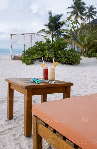 Два коктейля с кусочками фруктов на деревянном столе на пляже. Вкусные охлажденные напитки на фоне тропических деревьев и океана