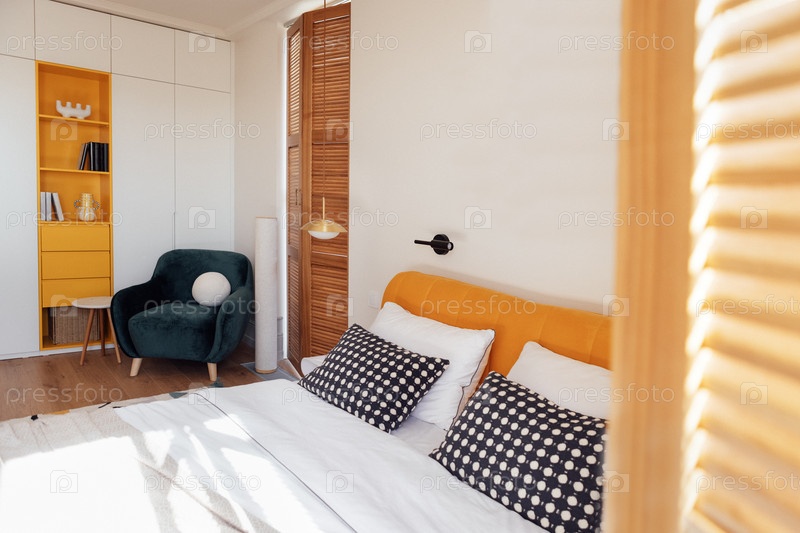 Современная спальня с удобной кроватью и ярко-желтым изголовьем