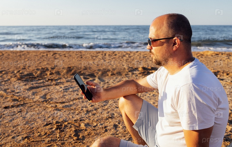 Молодой человек держит телефон у моря. Мужчина средних лет в солнцезащитных очках смотрит в свой мобильный телефон