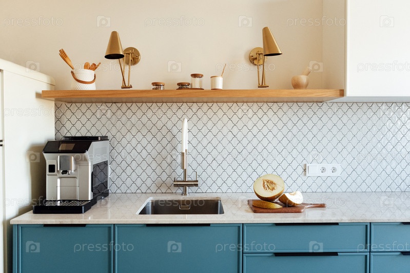 Современная кухня с синим гарнитуром и мраморной столешницей. Деревянные открытые полки с кухонными принадлежностями и стильными золотыми лампами. Кофемашина и нарезанная дыня на столе