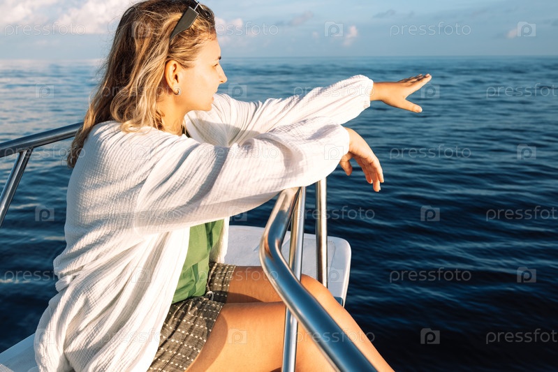 Молодая женщина в повседневной одежде сидит на корме яхты, наслаждаясь морским пейзажем. Привлекательная дама на морском отдыхе