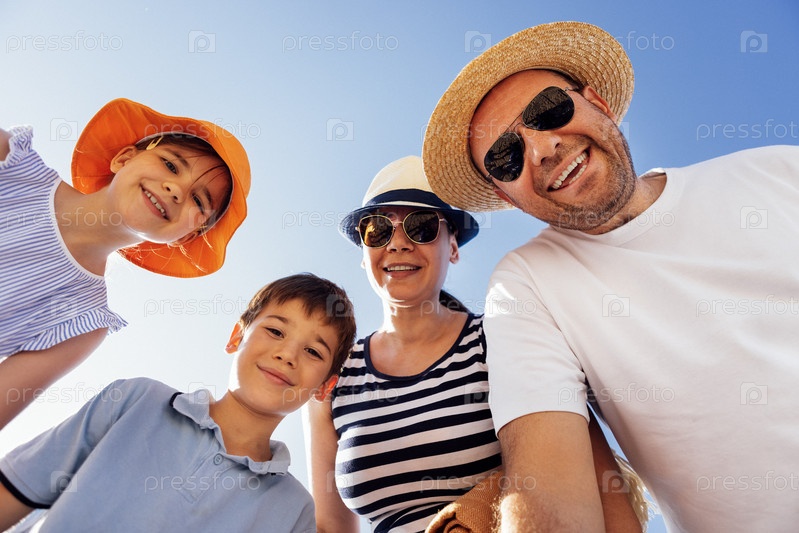 Молодая счастливая семья на летних каникулах на пляже. Милые дети и их родители в панамах