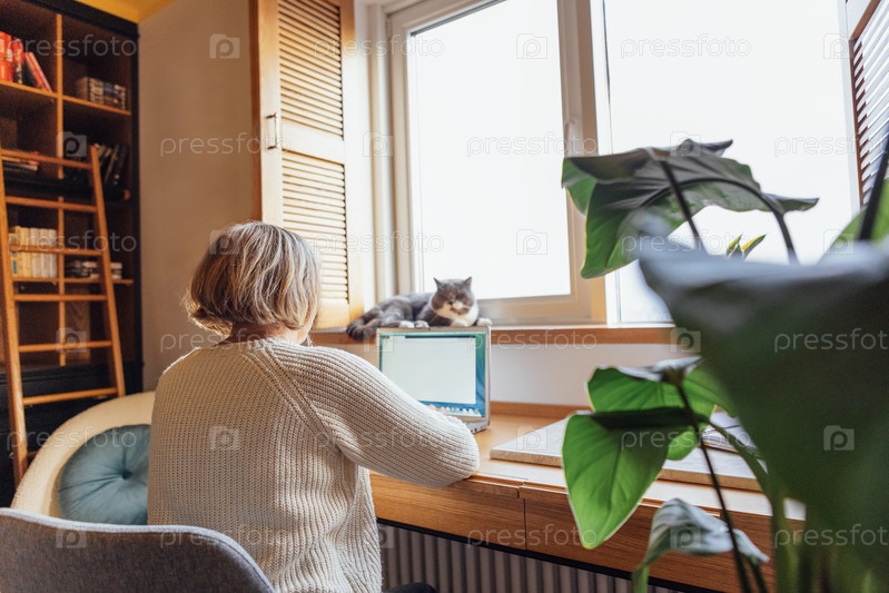 Пожилая женщина в повседневной одежде работает на ноутбуке. Зрелая дама печатает на компьютере