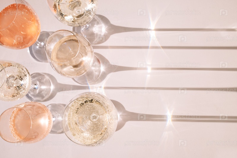 Крупный план элегантных бокалов с алкогольными напитками. Чашки с разноцветными игристыми винами из разных сортов винограда. Бокалы для шампанского на белом фоне. Вид сверху