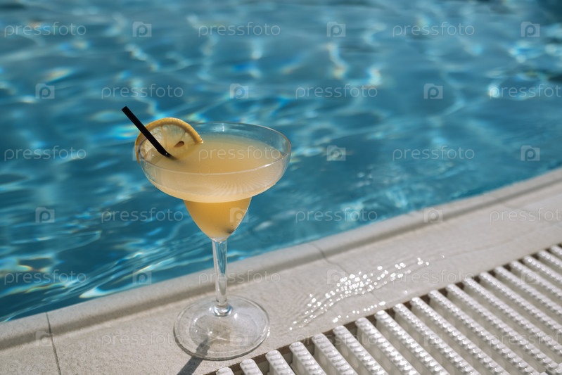 Элегантный бокал с коктейлем «Маргарита» с долькой лимона и соломинкой на краю бассейна