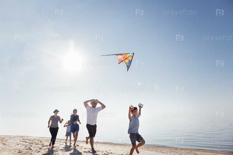Счастливая семья отдыхает на летних каникулах. Дети и их родители запускают воздушного змея на берегу реки