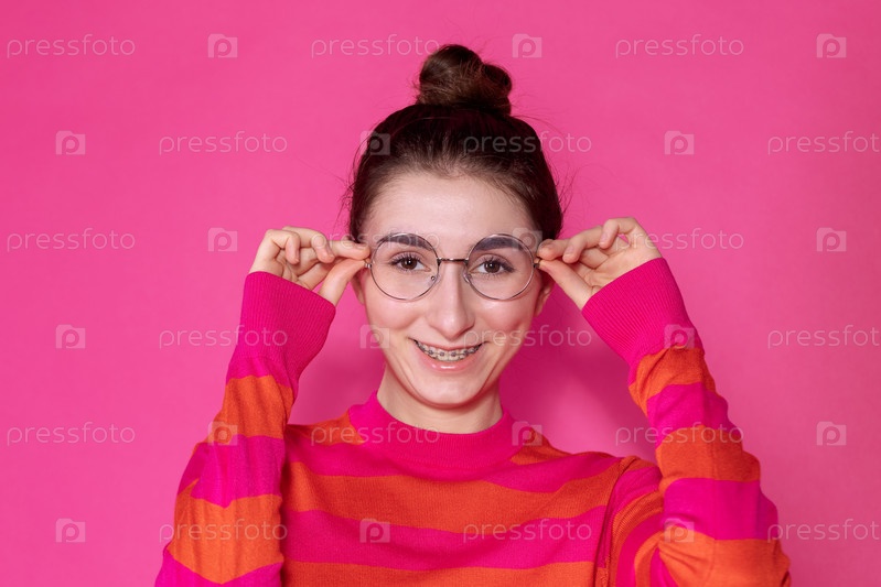 Улыбающаяся девушка протягивает очки и подмигивает на розовом фоне. Милый подросток с брекетами держит очки на ярком фоне. Девушка-подросток в повседневном полосатом свитере с очками в руках