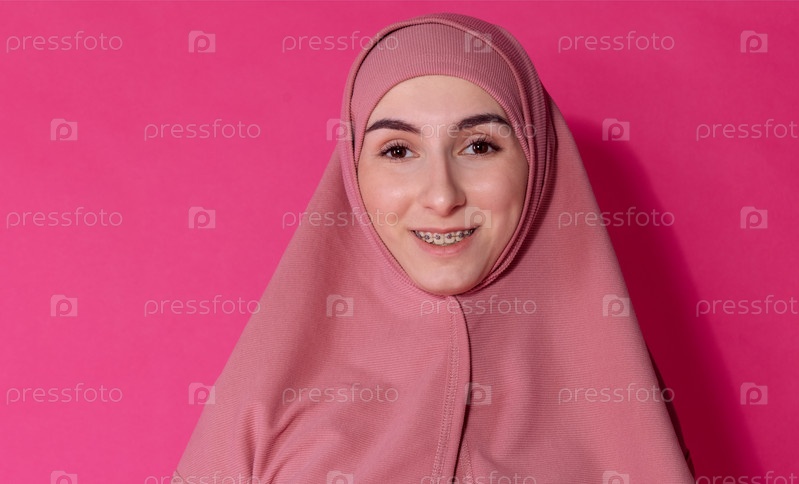 Арабская девочка в розовом хиджабе на розовом фоне. Милый подросток в мусульманской религиозной одежде улыбается на ярком фоне
