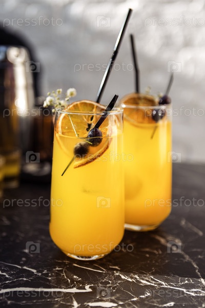 Крупный план двух бокалов с цитрусовым коктейлем на черном мраморном столе. Вкусные охлажденные напитки украшены дольками апельсина, сухоцветами и оливками