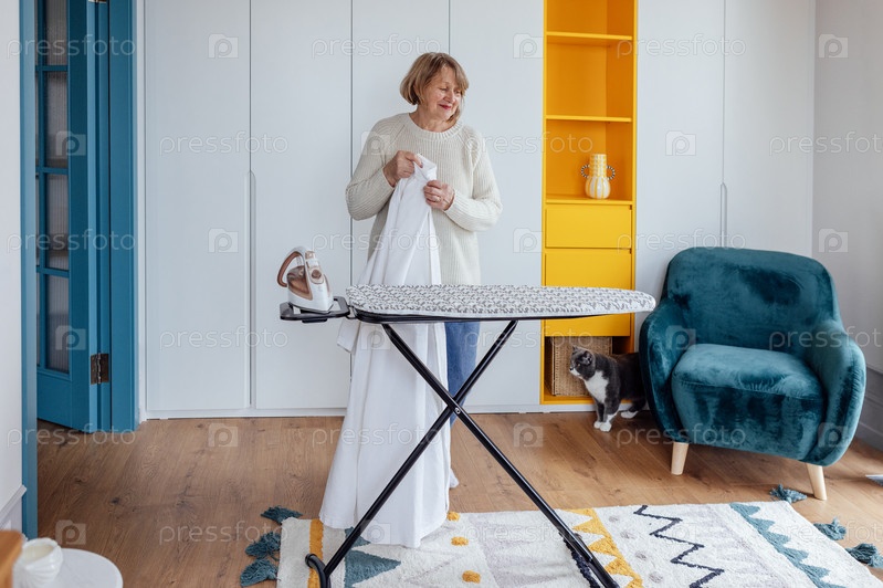 Крупный план пожилой женщины, гладищей одежду на гладильной доске