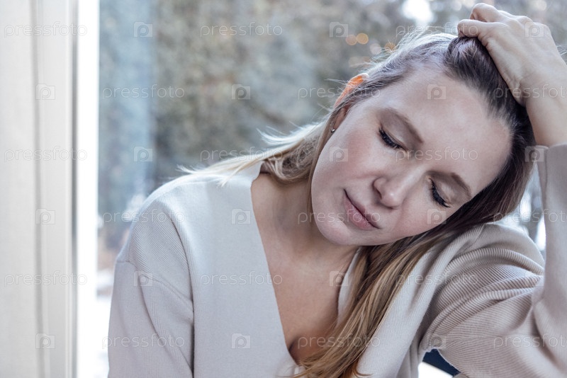 Женщина прислонилась к окну, глаза закрыты в раздумьях, рука в волосах