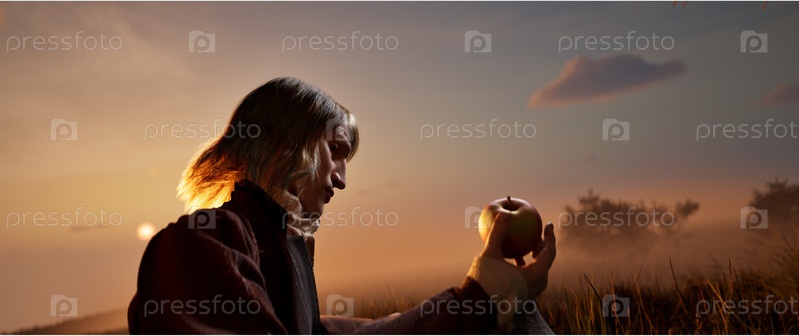 Исаак Ньютон держит в руке яблоко, рассуждает о гравитации, рассказывает историю формулировки закона всемирного тяготения