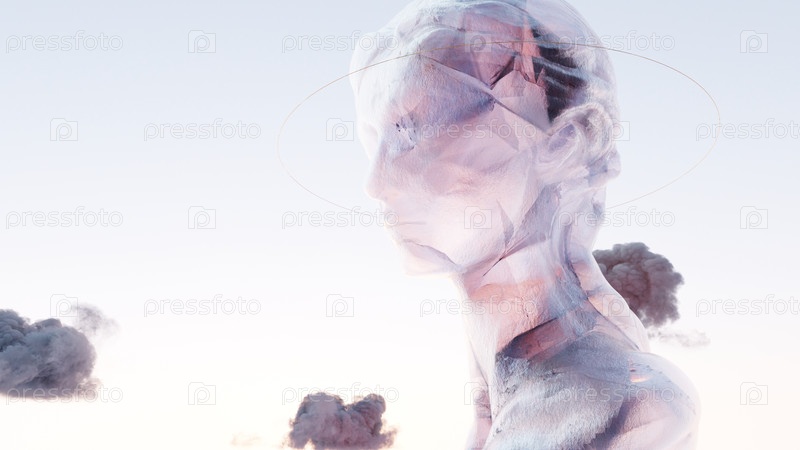 Прозрачный, воздушный бюст с вращающимся вокруг него небесным шаром на фоне пастельного неба