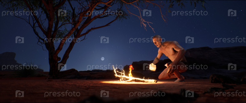 Древний человек, представляющий раннюю стадию развития человечества, использует кремень для добывания огня