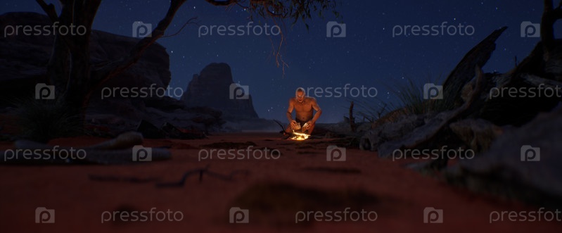 Древний человек, представляющий раннюю стадию развития человечества, использует кремень для добывания огня