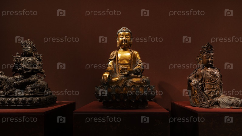 Музейный экспонат старинной скульптуры трех Будд в позе лотоса, олицетворяющей просветление и нирвану