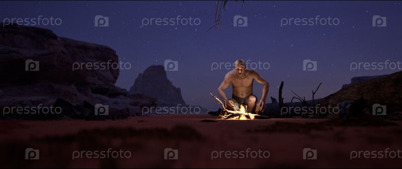 Древний человек, представляющий раннюю стадию развития человечества, использует кремень для добывания огня