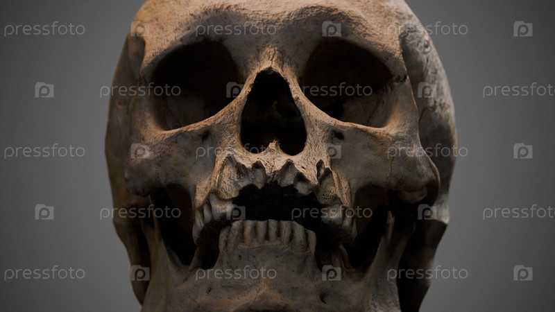 3D-модель человеческого черепа с эффектами искажения в стиле фильмов ужасов, снятая крупным планом