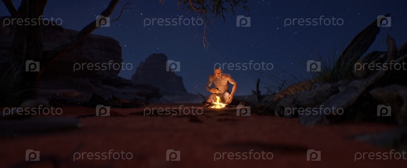 Древний человек, представляющий раннюю стадию развития человечества, использует кремень для добывания огня
