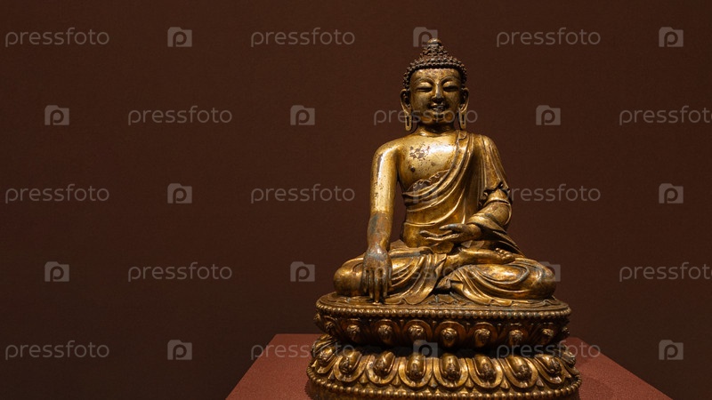 Музейный экспонат, представляющий старинную статую Будды в позе лотоса