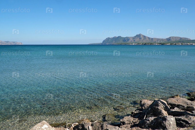 Пейзаж с берегом южного моря и горами на горизонте в летний день