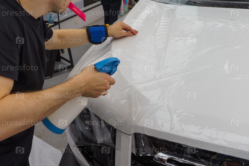 Рабочий наносит прозрачную пленку на автомобиль, чтобы защитить его от гравия и царапин на капоте белого автомобиля. Нанесение прозрачной защитной пленки на краску