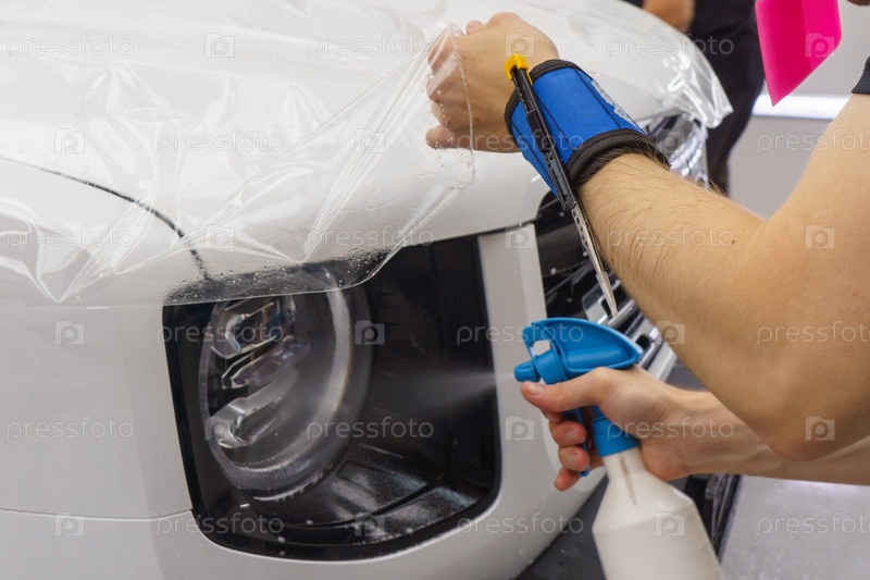 Рабочий наносит прозрачную пленку на автомобиль, чтобы защитить его от гравия и царапин на капоте белого автомобиля. Нанесение прозрачной защитной пленки на краску
