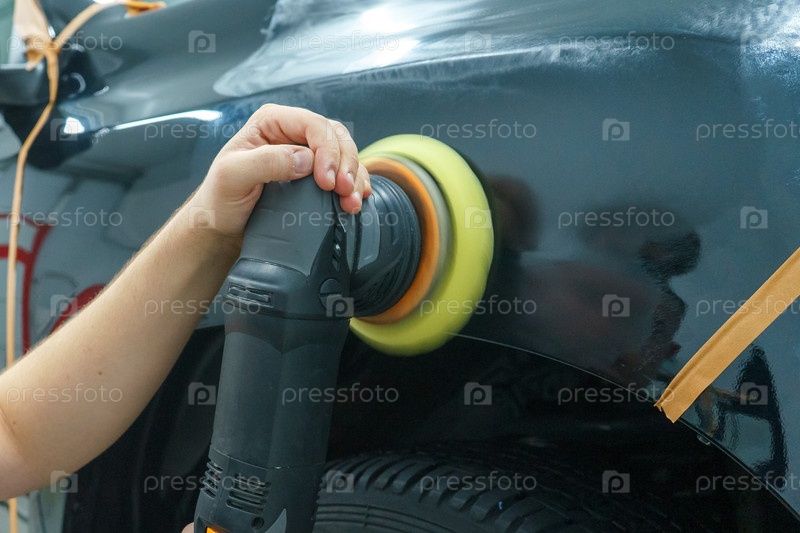 Забота о внешнем виде автомобиля. Мастер полирует переднее крыло черного автомобиля. Детейлинг