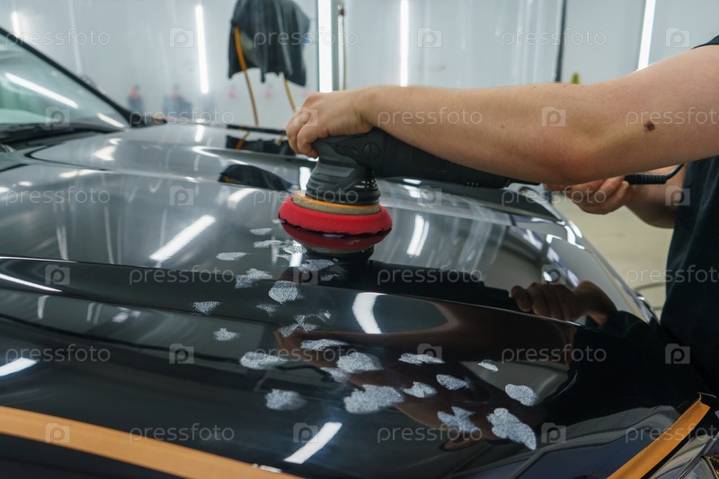 Забота о внешнем виде автомобиля. Мастер полирует капот черного автомобиля. Детейлинг