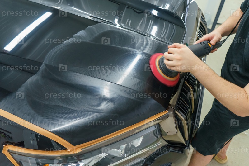 Забота о внешнем виде автомобиля. Мастер полирует капот черного автомобиля