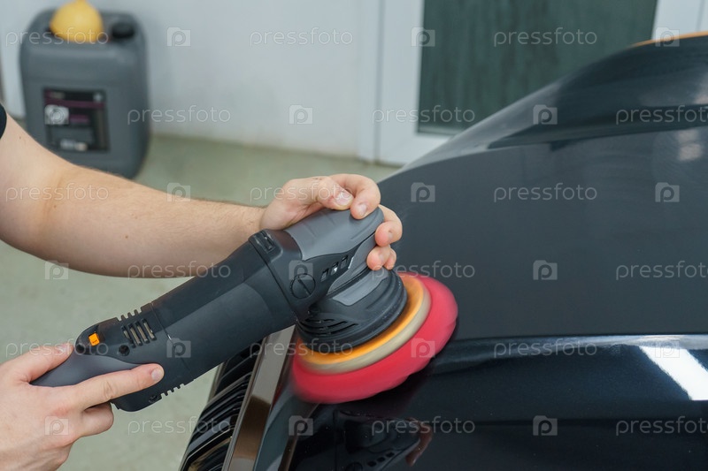Забота о внешнем виде автомобиля. Мастер полирует капот черного автомобиля
