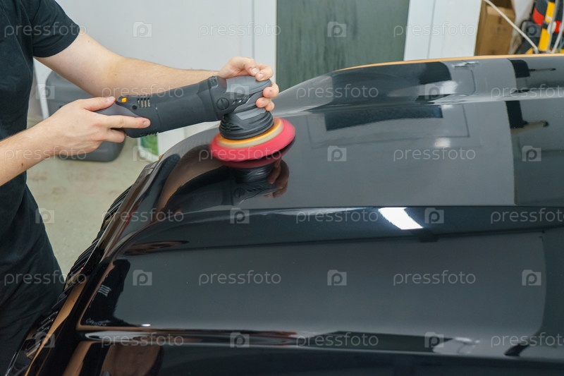 Забота о внешнем виде автомобиля. Мастер полирует капот черного автомобиля