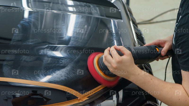 Забота о внешнем виде автомобиля. Мастер полирует капот черного автомобиля