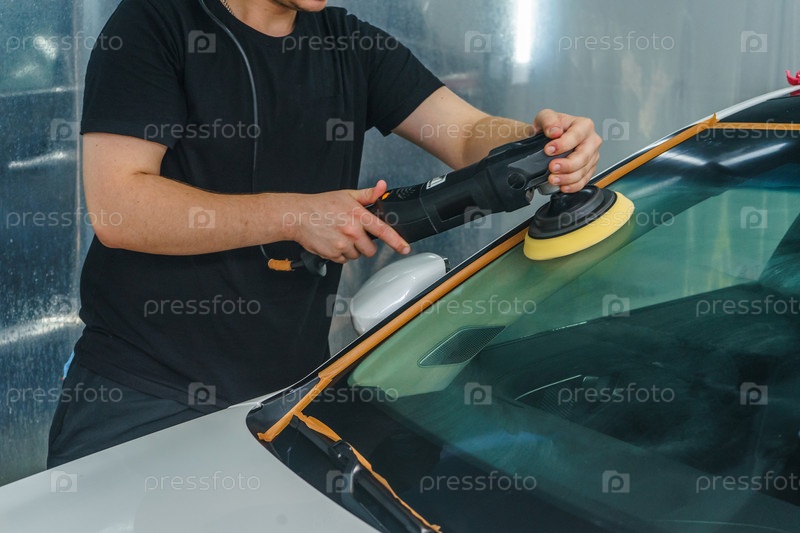 Забота о внешнем виде автомобиля. Мастер полирует лобовое стекло автомобиля. Детейлинг