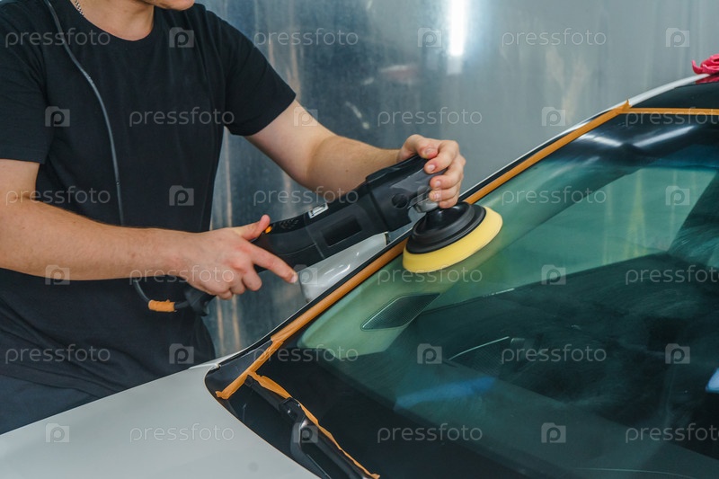 Забота о внешнем виде автомобиля. Мастер полирует лобовое стекло автомобиля. Детейлинг