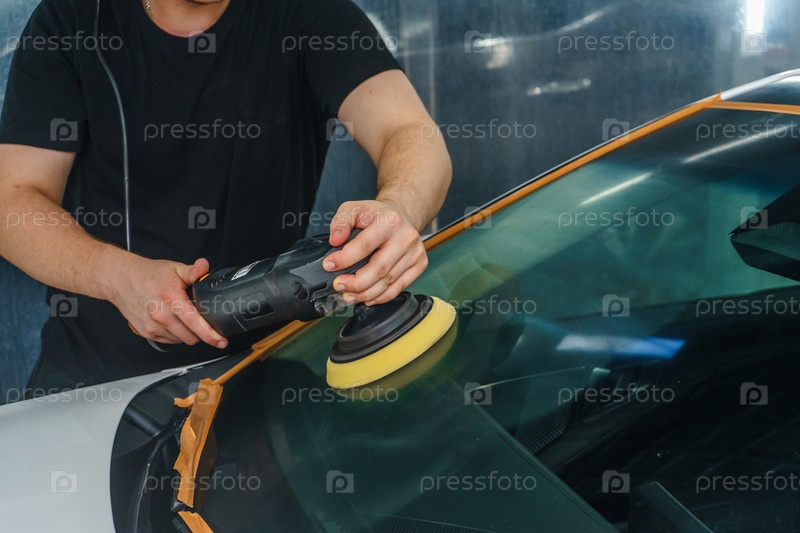Забота о внешнем виде автомобиля. Мастер полирует лобовое стекло автомобиля. Детейлинг