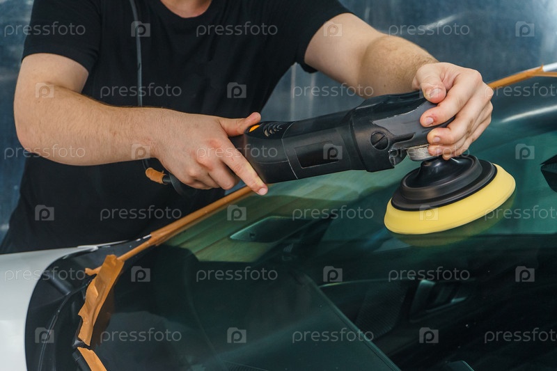Забота о внешнем виде автомобиля. Мастер полирует лобовое стекло автомобиля. Детейлинг