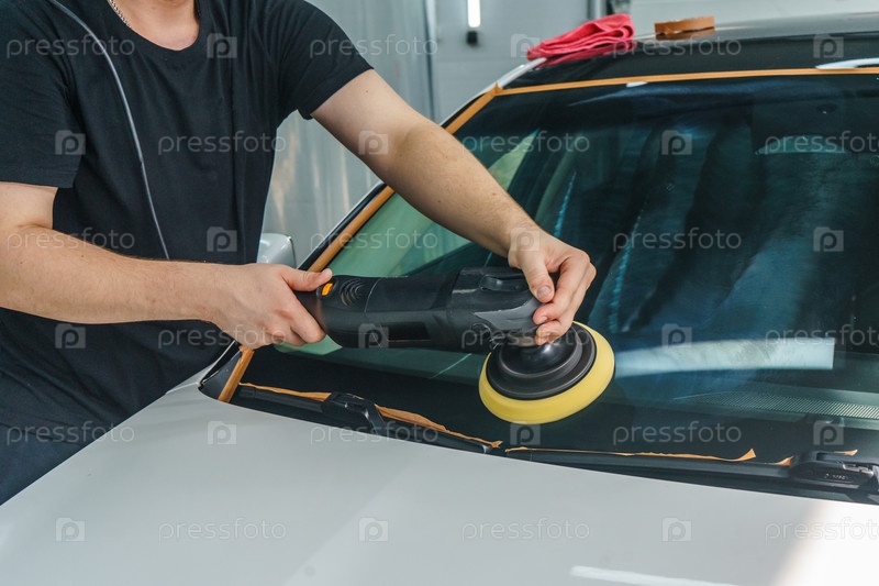 Забота о внешнем виде автомобиля. Мастер полирует лобовое стекло автомобиля. Детейлинг
