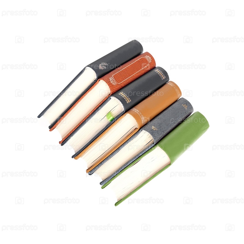 Стопка книг в цветных обложках с белыми листами, изолированных на белом фоне