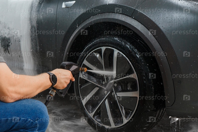 Смывание пены с колеса автомобиля на автомойке. Распыление воды на автомобиль с помощью пульверизатора. Мойка колес автомобиля