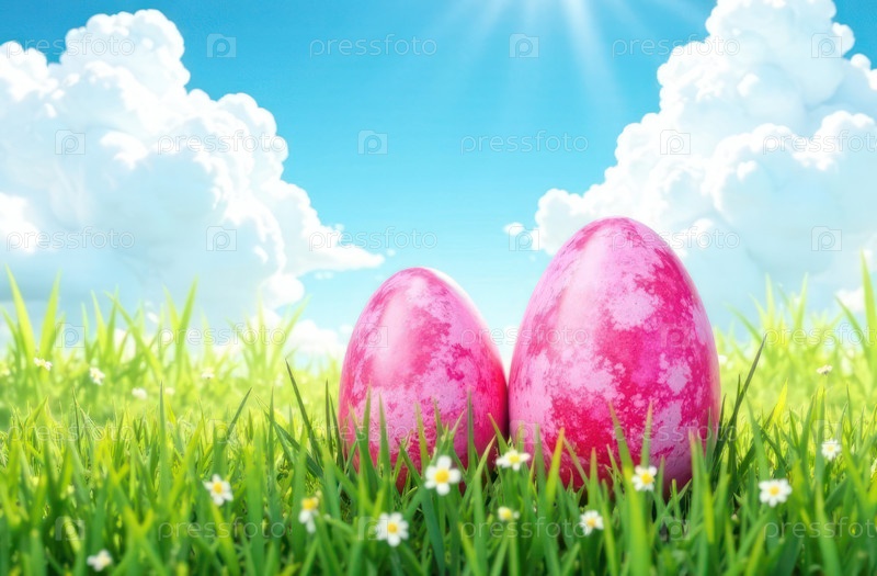 Пасхальные яйца, окрашенные в розовый цвет, лежат в траве. Пасхальный фон для открытки