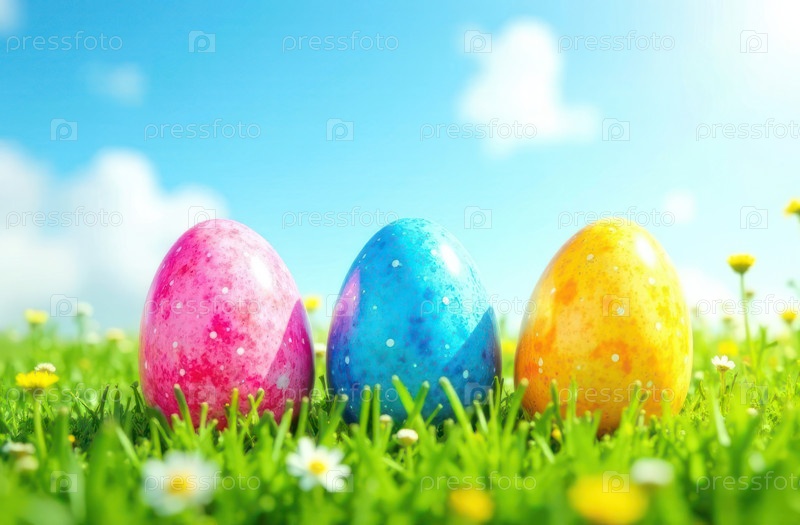 3 пасхальных яйца, окрашенных в розовый, голубой и желтый цвета, лежат в траве на лугу. Пасхальный фон для открытки