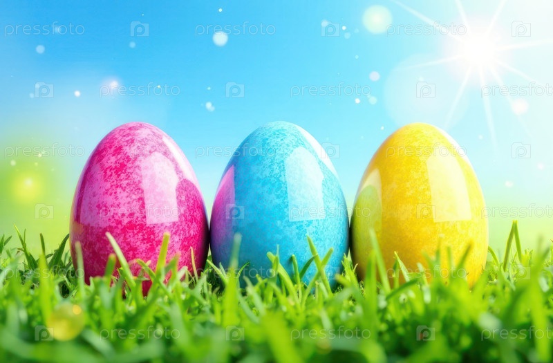 3 пасхальных яйца, окрашенных в розовый, голубой и желтый цвета, лежат в траве на лугу. Пасхальный фон для открытки