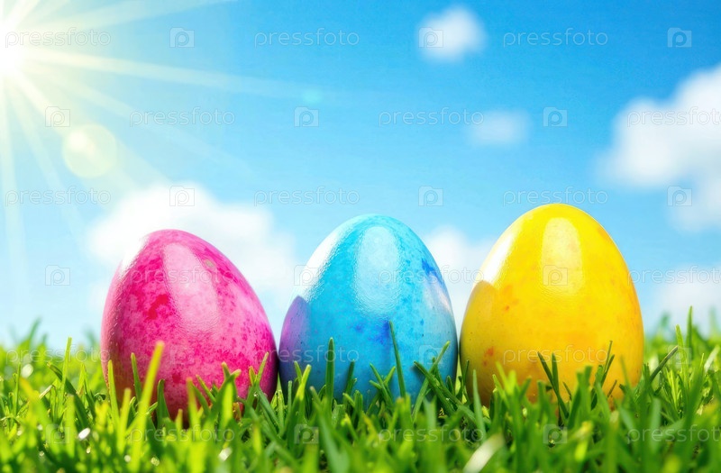 3 пасхальных яйца, окрашенных в розовый, голубой и желтый цвета, лежат в траве на лугу. Пасхальный фон для открытки