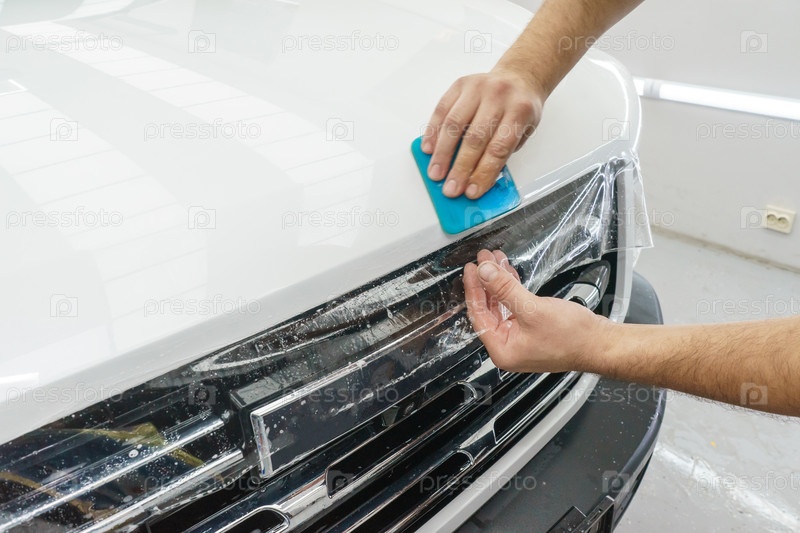 Рабочий наносит прозрачную пленку на автомобиль, чтобы защитить его от гравия и царапин на капоте белого автомобиля. Нанесение прозрачной защитной пленки на краску